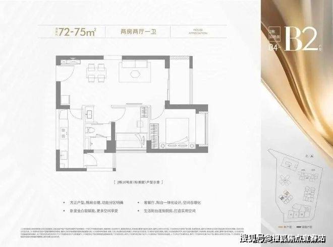 72-75㎡的2房2厅1卫,设计的是竖厅格局,客厅3.2米开间,LDKB一体化设计,进深7.2米,一字型厨房还带1个生活阳台,卫生间三段式分离,得房率约72.28%(不含赠送),西南、东南或东北朝向。