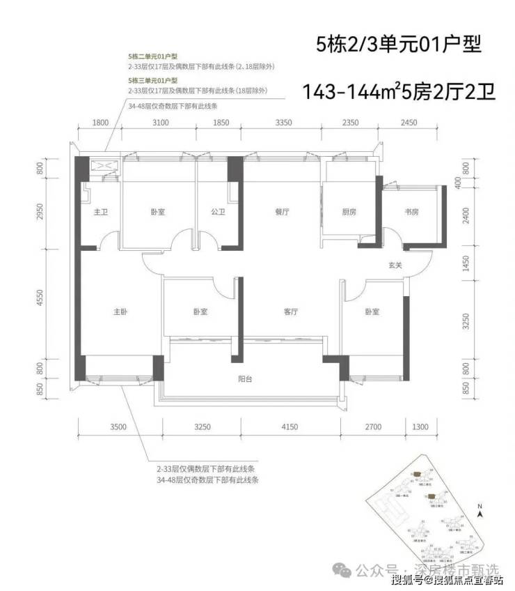 【五栋三单元-平面图】3梯4户,4条腿,跟二单元的户型产品一模一样,01号房户型约144㎡的5房2厅2卫,02、03号房户型约96㎡的3房2厅2卫,04号房户型约115㎡的4房2厅2卫。