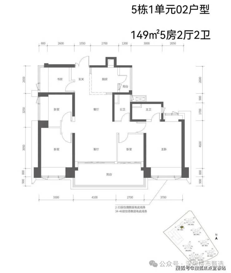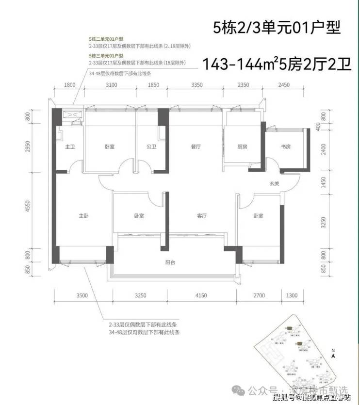【五栋一单元-平面图】3梯3户,3条腿,分别是01、03号房户型约173㎡的5房2厅2卫、02号房户型约149㎡的5房2厅2卫