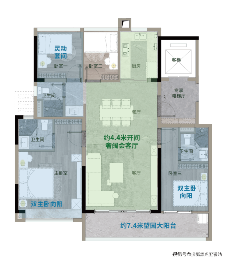 约7.4米奢阔大阳台揽山望园,双套房设计满足三代同堂家庭对独立空间与亲密共处的双重需求,主卧步入式衣帽间提升生活品质,是精英家庭理想之选。