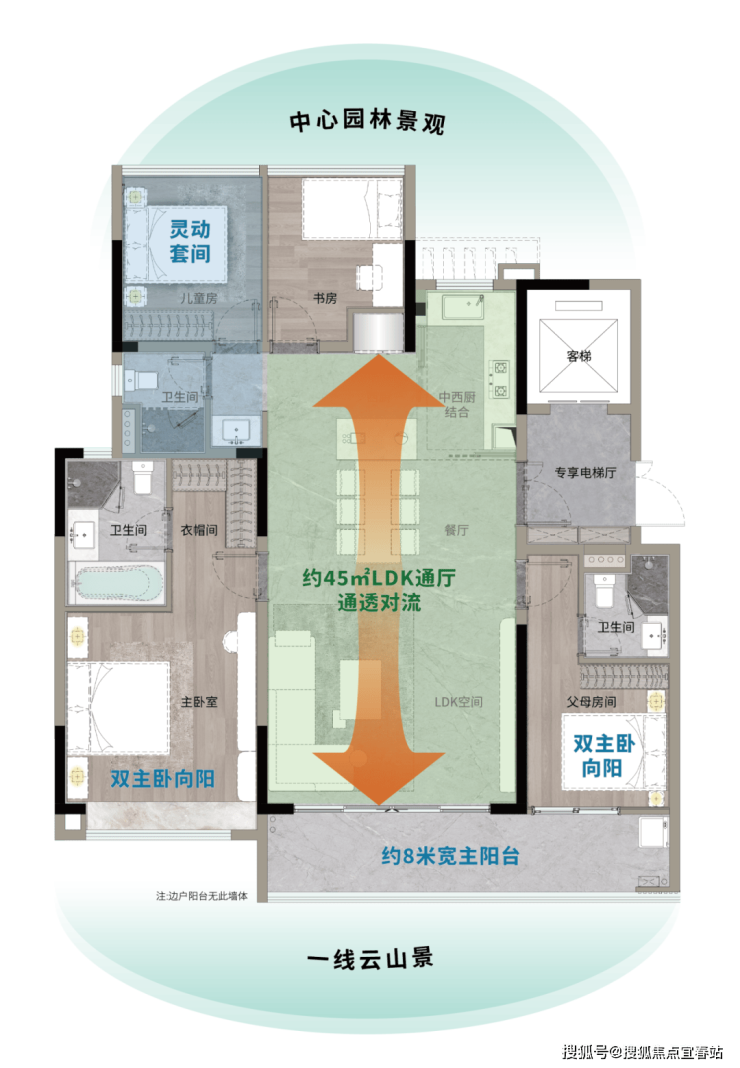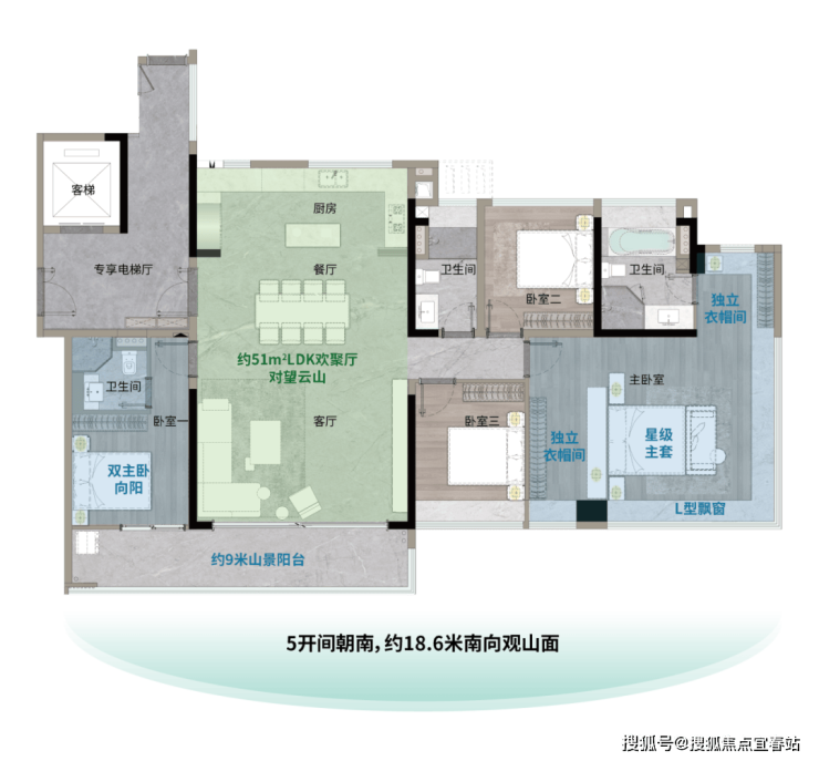 奢享约18.5米总开间,五开间向阳。约50㎡LDK一体化空间,搭配中西双厨,尽显风范;星级主套房配备双独立衣帽间及270°全景飘窗,尽览云山盛景,是追求多代同堂和乐生活的塔尖家庭优选。