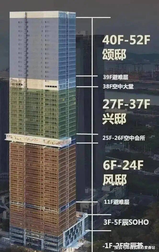 天幕藏品,总建面约8.6万㎡,主打建面约125-280㎡天幕藏品,分布在楼层的中区、高区、超高区,分别命名为风邸(6-24F)、兴邸(27-37F)和颂邸(40-52F)。