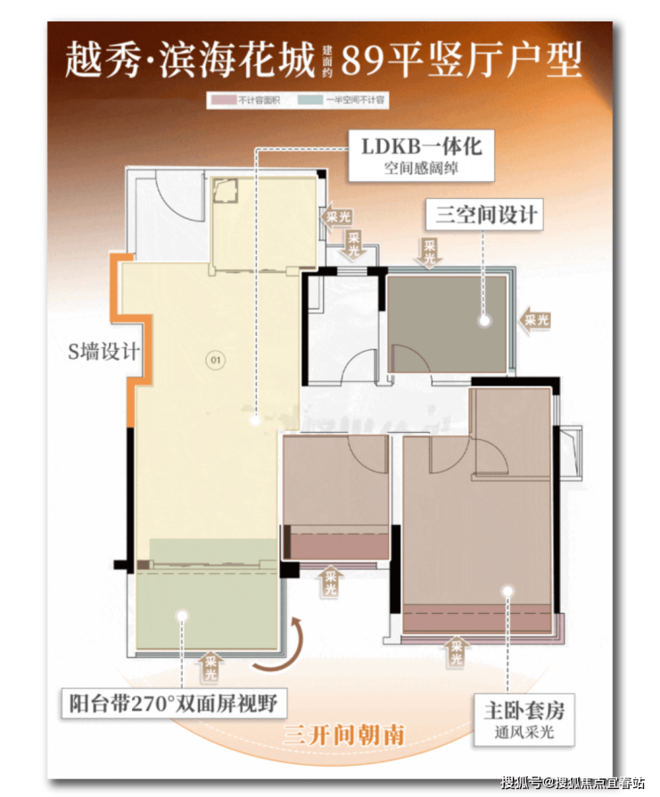 建面89平的户型,项目做了 三个270°视野(景观阳台、主卧和次卧),并且还是 三空间带主套。