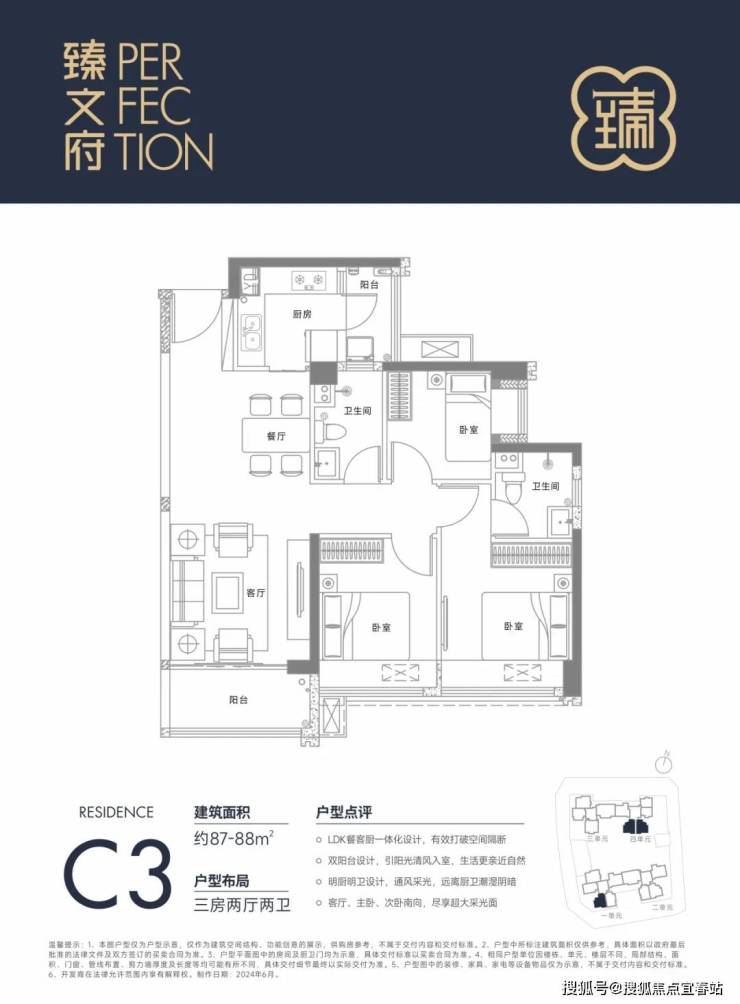 87㎡的3房2厅2卫,设计的是经典竖厅格局,进门入户玄关,LDKB一体化设计,三开间朝南,L型厨房还带1个小生活阳台,卫生间干湿分离,得房率约85%(包含赠送),阳台朝东南向。