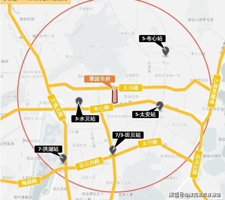翠园华府楼盘位于深圳市罗湖区太白路与东盛路交汇处,毗邻开智幼儿园、奥斯韩外语学校及东湖中学,对面是园岭公园,方圆500米内有粤海城、太阳新城等商业配套,再远一些,2公里内还有喜荟城、IBC、万象汇等,不仅可满足日常的购物需求,也可满足消费升级需求。距离地铁3号线水贝站约760米;5号、7号线太安站约1000米。学区为东昌小学、翠园东晓中学。
