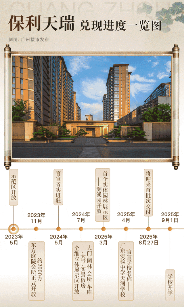 作为保利高端人居序列,项目承袭 “天字系” 严苛营造标准,由央企保利发展控股(世界 500 强)倾力打造 [5]。建筑采用 95% 玻璃铝板 + 陶板全幕墙体系,公建化设计颜值与质感兼具;社区以 “东方气韵为魂,现代精工为骨”,打造约 6.8 万㎡中式府院园林,一轴三境、五序九礼布局,搭配下沉式会所与恒温泳池,全龄生活场景拉满 [12]。目前首批已交付,社区实景、园林景观、公区配套均可见,准现楼品质更有保障 [12]。