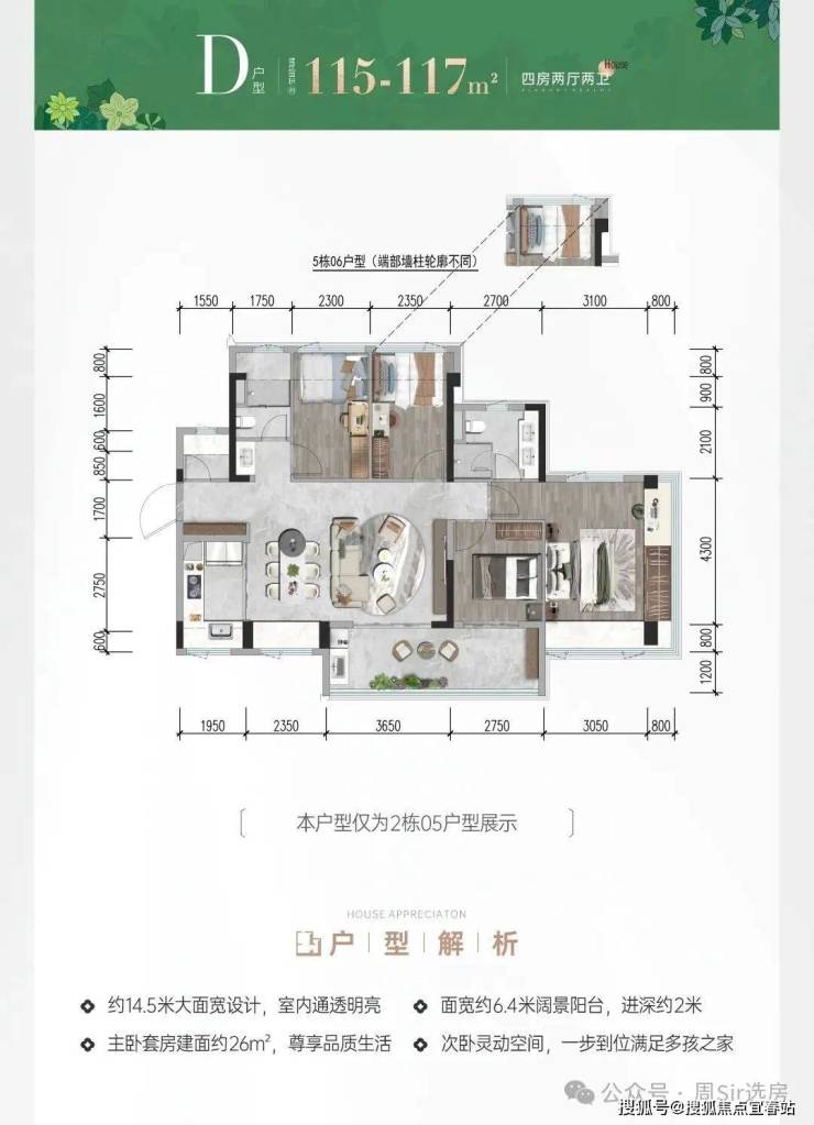 115-117㎡的4房2厅2卫,横厅南北通透格局,客餐厅6米开间,主卧套房双飘窗,4个卧室分别做到了主卧20.83㎡/次卧8.74㎡/次卧8.93㎡/次卧8.25㎡(含飘窗),客厅连接次卧出12.8㎡的巨幕大阳台,得房率约78.9%(不含赠送),阳台主朝东南向。加上赠送后得房率约98.44%。