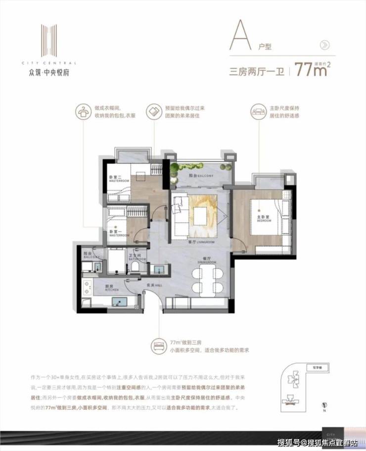 中央悦府开创多功能户型,建筑面积约77㎡三房片区仅此户型;