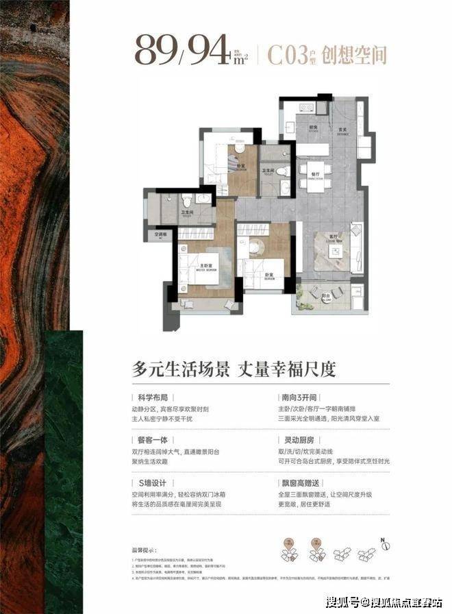 89-94㎡的4房2厅2卫,03.04户型,设计的是经典竖厅格局,进门入户玄关,客厅实测3.245米开间,LDKB一体化,S墙设计预留冰箱卡槽位,三开间朝南,3个卧室分别做到了主卧13.76㎡/次卧8.28㎡/次卧7.74㎡(实测面积,不含墙体),U型灵动式厨房,卫生间干湿分离,得房率约76-81%(不含赠送),东南朝向。