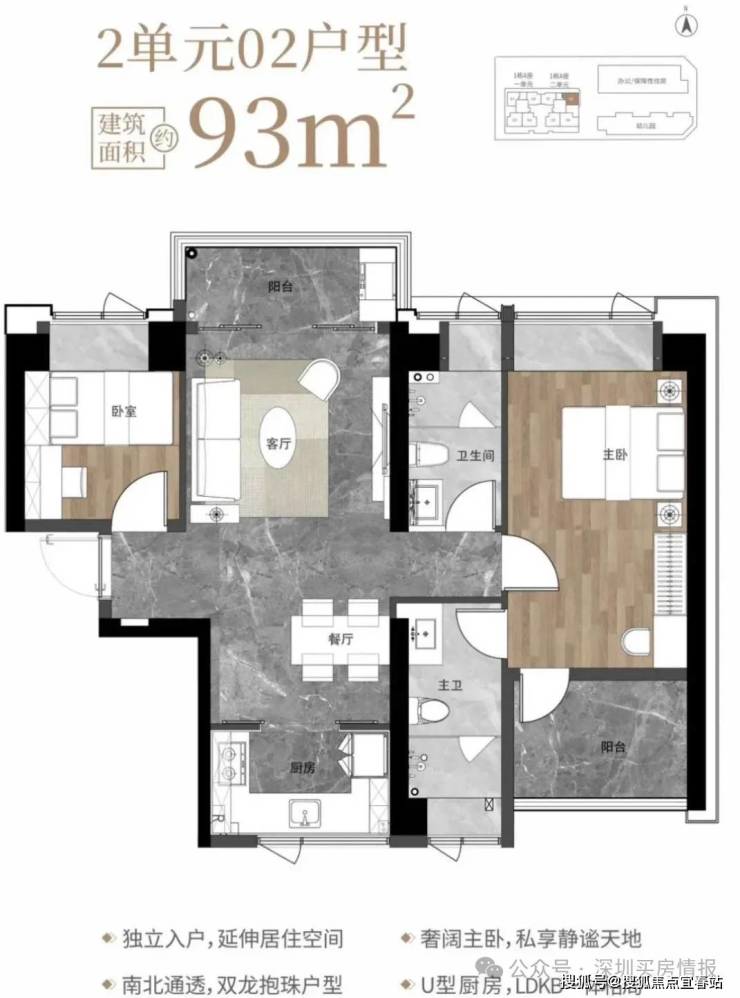 93㎡的3房2厅2卫,1栋2单元02户型,设计的是竖厅南北通透格局,独立入户,客厅3.6米开间,客餐厅分离设计,U型厨房,卫生间干湿分离,阳台正北朝向。