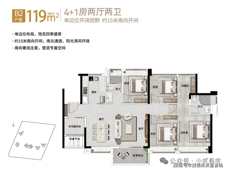 【119㎡4+1房2厅2卫】单边位布局,15米南向开间,南北通透