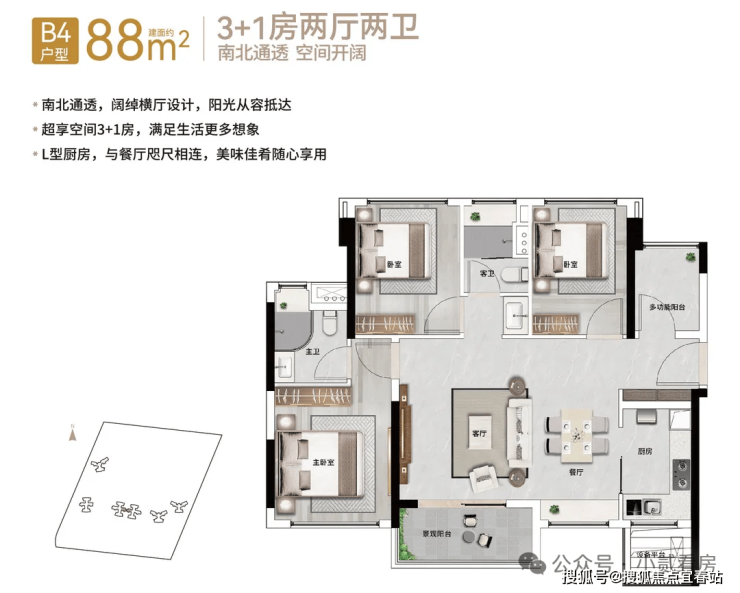 【88㎡3+1房2厅2卫】经典竖厅格局,三开间采光,近11㎡主卧套房设计,优享生活逸趣,稀缺小户型,低总价晋阶天河