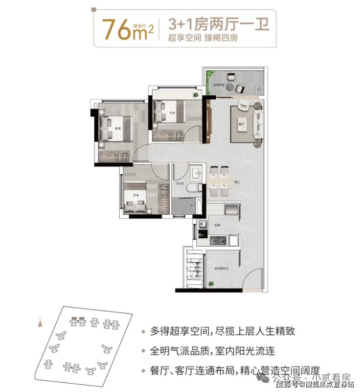 【76㎡3+1房2厅1卫】餐厅、客厅连通布局,低总价晋阶天河