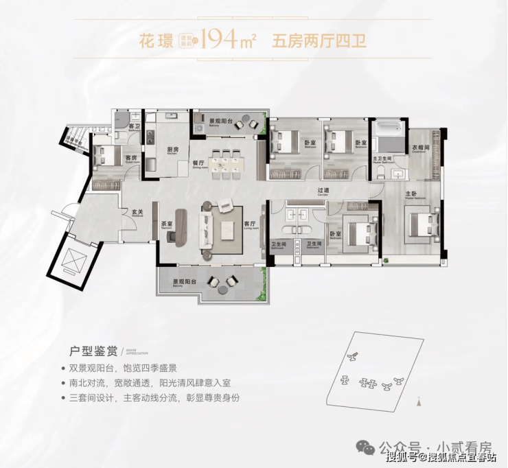 【194㎡五房2厅4卫(三套房)】南北对流双景观阳台,观景生活两不误