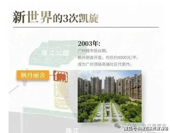 同年,凯旋新世界一期枫丹丽舍开盘,以约8000元/平的均价,成为广州顶级高端社区的代表作。