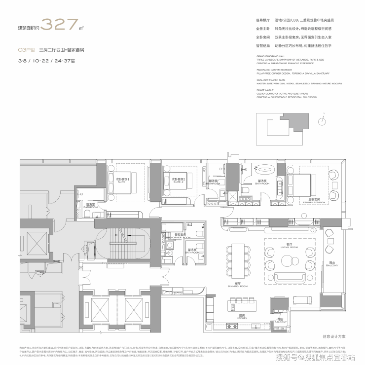 业态组成:4栋51至63层3.6-3.9米层高公寓(含388米主塔楼T1,为深超总标志性工程)、2栋高层办公楼、19套独栋董事公馆、16套合院别墅,以及约1.4万㎡高端定制商业;
