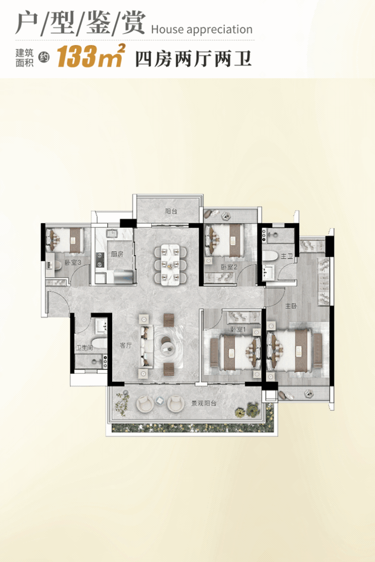 建面约133㎡四房。
