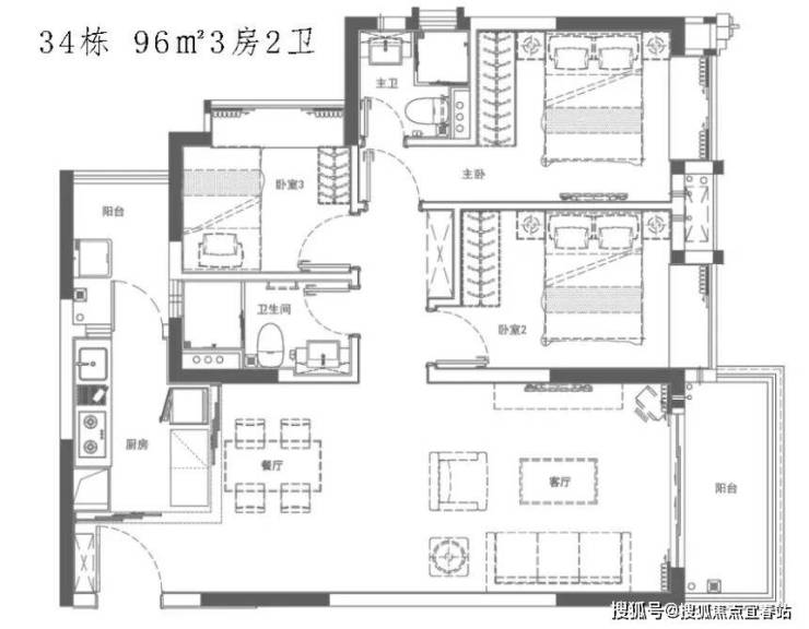 96㎡三房更适合三口之家,动静分区清晰,U 型厨房台面长 3.8 米