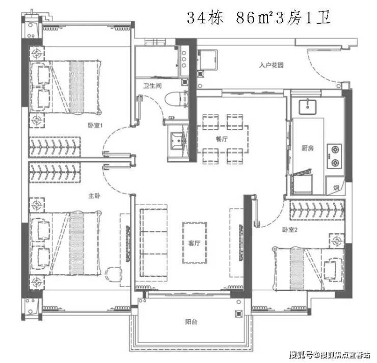 86㎡三房有两种布局:
