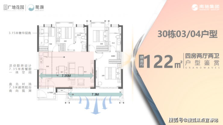 改善家庭可以看 122㎡四房,南北对流的格局让穿堂风很舒服