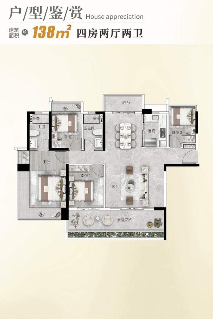 建面约138㎡四房,便将这种品质感演绎得淋漓尽致。