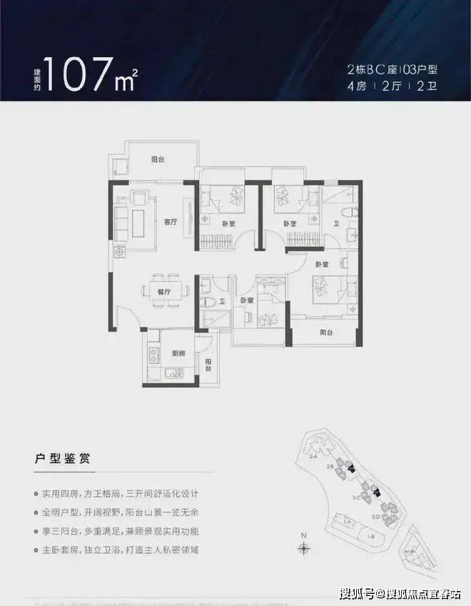 107㎡的4房2厅2卫,设计的竖厅格局,客厅主卧双阳台设计,厨房也带小阳台,客厅朝东北向,高层可看水库景观。