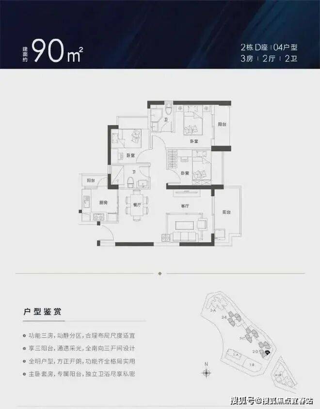 90㎡的3房2厅2卫,设计的竖厅格局,客厅主卧双阳台设计,厨房也带小阳台,三开间朝南,客厅朝东南向。