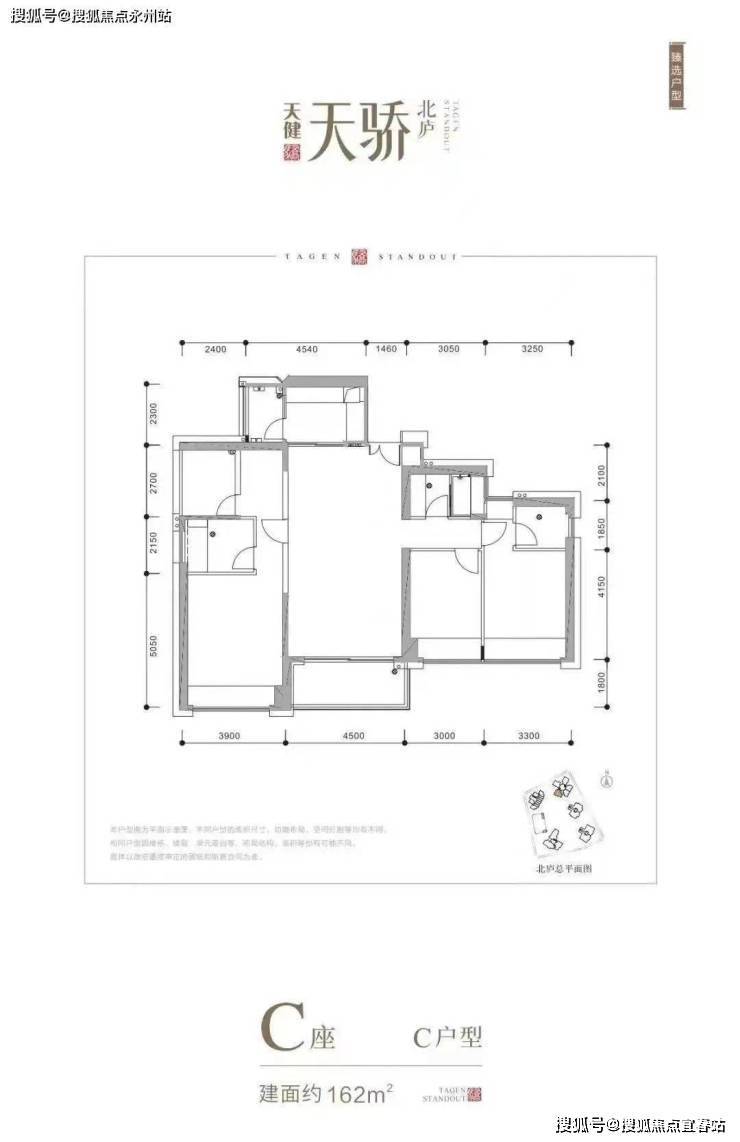 C座建筑面积约162㎡户型:东南西朝向,大开间短进深,主要生活空间光照充足。4.5米客厅开间,带有1.8米进深大阳台。双套间配置,开间进深比良好,空间利用充分,采光优秀。双次卧开间进深比良好,都可以做主卧室使用。餐厨空间宽敞舒适,厨房带有独立生活阳台,可与厨房合并使用。