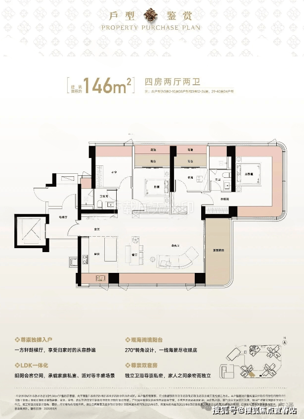 146㎡的4房2厅2卫,设计的是竖厅格局,尊享独立电梯入户,LDKB一体化设计,动静分区,主卧270°无柱转角全景舱,L型厨房+岛台设计,卫生间干湿分离,得房率约105%(包含赠送),东南朝向看海景景观。