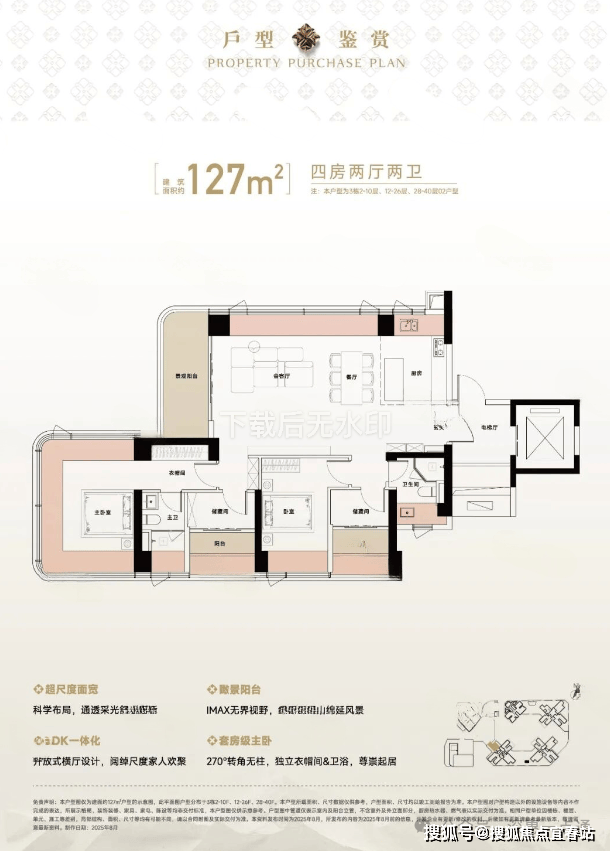 127㎡的4房2厅2卫,设计的是竖厅格局,尊享独立电梯入户,LDKB一体化设计,动静分区,六开间朝南,主卧270°无柱转角全景舱,L型厨房+岛台设计,卫生间干湿分离,得房率约105%(包含赠送),西北朝向看一线梧桐山景观。