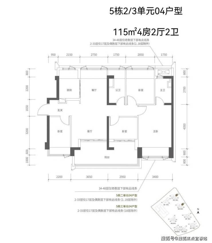 【五栋三单元-平面图】3梯4户,4条腿,跟二单元的户型产品一模一样,01号房户型约144㎡的5房2厅2卫,02、03号房户型约96㎡的3房2厅2卫,04号房户型约115㎡的4房2厅2卫。