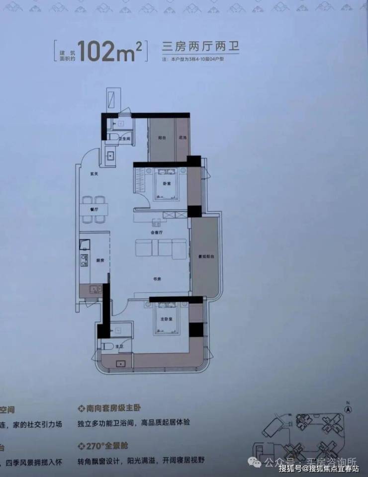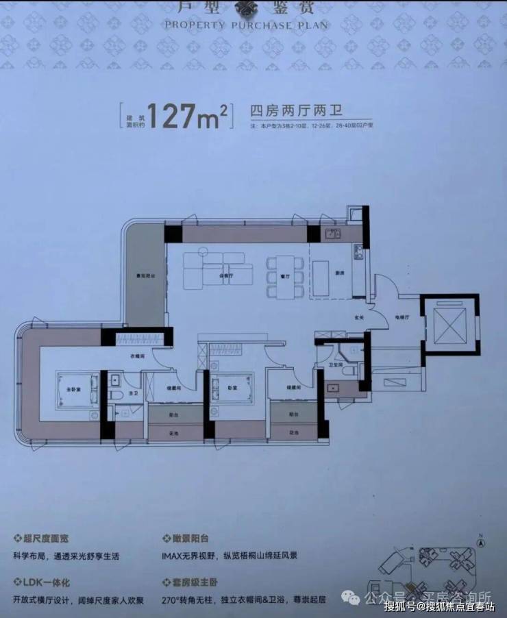 总占地面积约1.58万㎡,总建筑面积约14.1万㎡,计容建筑面积约10.44万㎡,容积率6.54,绿化率40.01%,共由4栋31-45层高住宅组成,4梯5户(低区)/4梯4户(高区)、约125㎡以上专梯专户