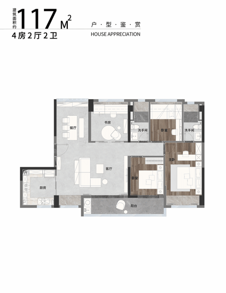 约12米南向面宽,南北对流,餐客厅阳台一体,并且做到了约4.2米大开间,在同等面积段户型产品中,给予更奢阔的空间体验。