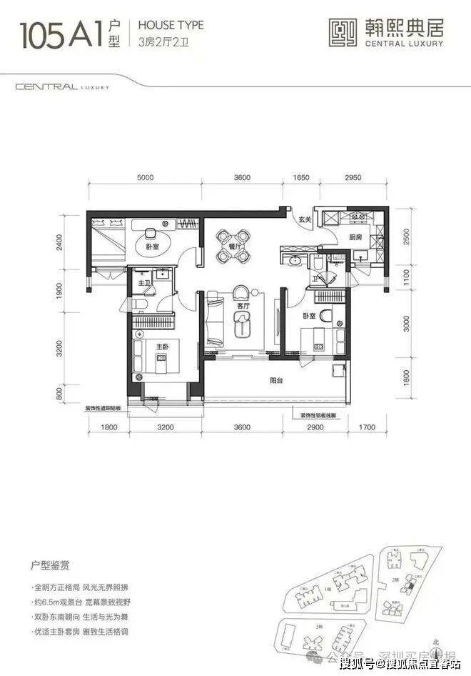 经典的双龙抱珠布局,主人空间与客卧空间互不干扰,具备私密性优势。并且户型方正,实用三房两厅两卫。朝南向四开间面宽共约 13.2m,全明空间,采光极佳。这个户型含赠送半阳台和飘窗的面积后使用率可达约 83%,这在超高层中是比较高的使用率。
