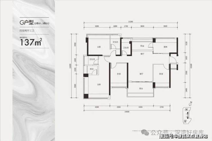 建面约137㎡双套间户型(四房三卫)