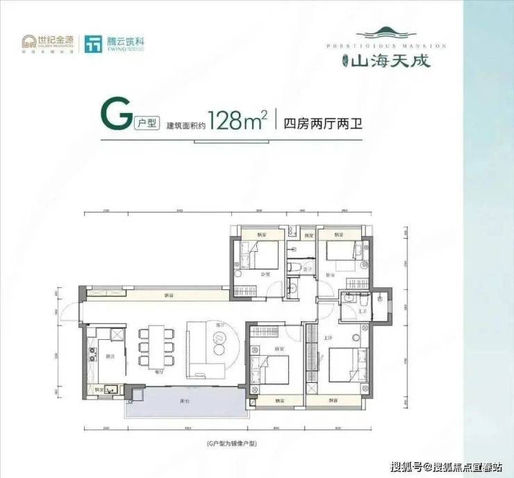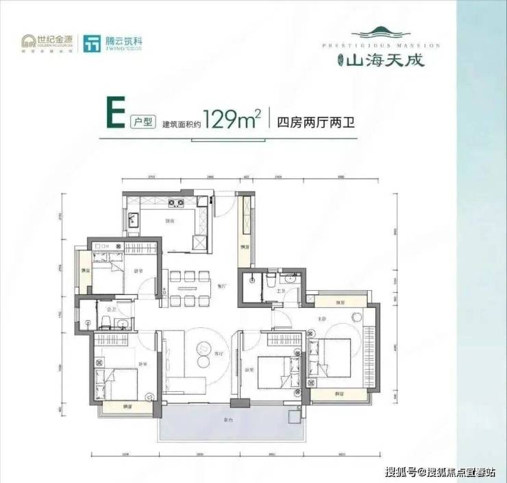129㎡的4房2厅2卫,设计的是竖厅双龙抱珠格局,客厅3.8米开间,四开间朝南,4个卧室分别是3.6米/3.2米/3米/2.7米的宽度,U型厨房,