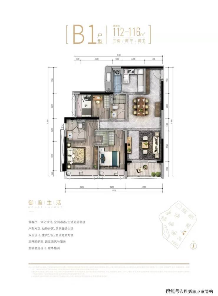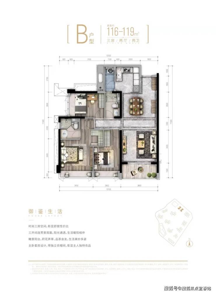 建面约112-119平三房两厅两卫;