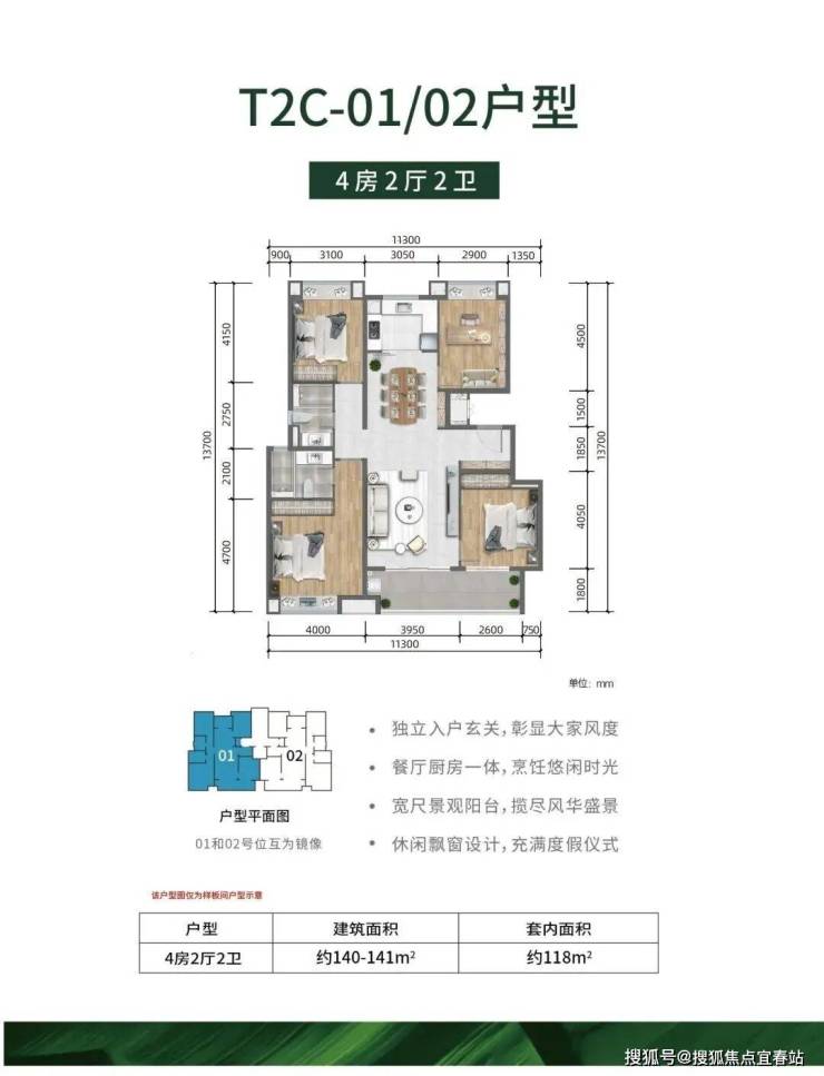 :4 房 2 厅 2 卫,建筑面积约 140 - 141m²,套内面积约 118m²。独立入户玄关彰显大气,餐厅厨房一体方便烹饪,宽尺景观阳台可揽尽美景,还有休闲飘窗,充满度假仪式感。