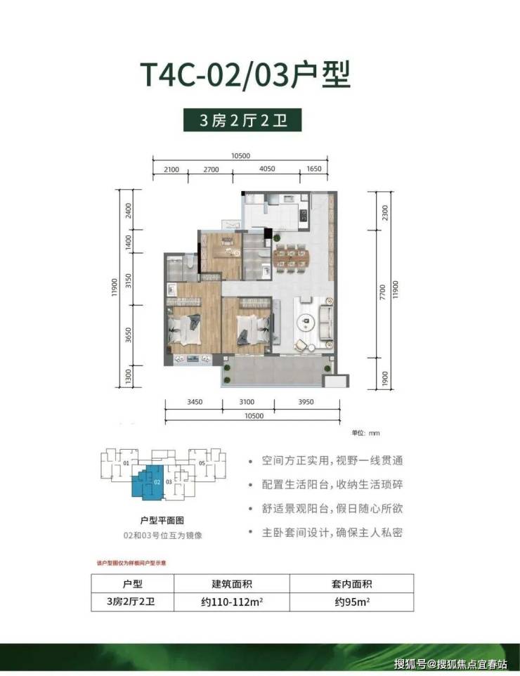 :3 房 2 厅 2 卫,建筑面积约 110 - 112m²,套内面积约 95m²。空间方正实用,视野通透,配置生活阳台方便收纳,景观阳台让假日更惬意,主卧套间保障主人私密。