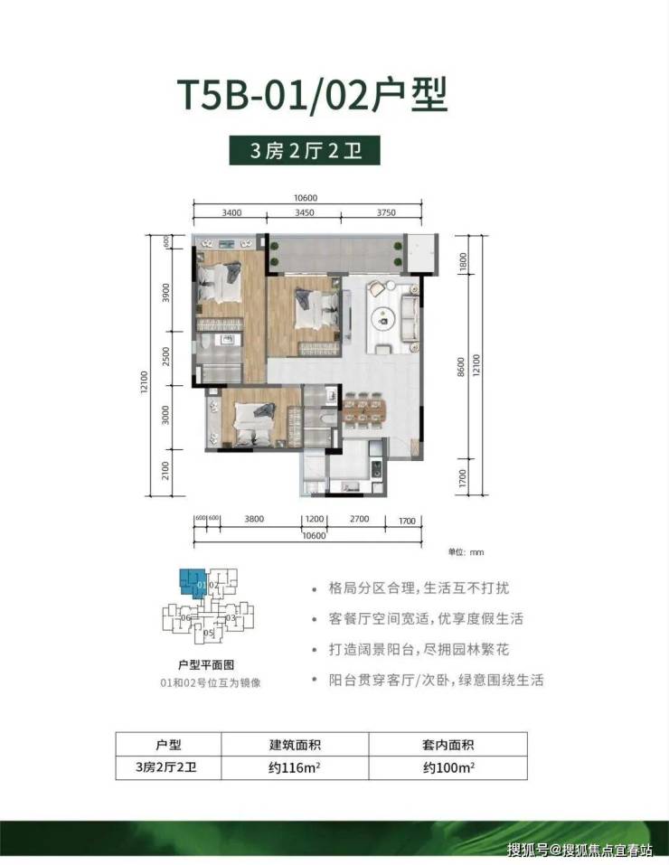 :3 房 2 厅 2 卫,建筑面积约 116m²,套内面积约 100m²。格局分区合理,互不打扰。客餐厅宽敞舒适,阔景阳台可欣赏园林美景,阳台贯穿客厅和次卧,绿意环绕。