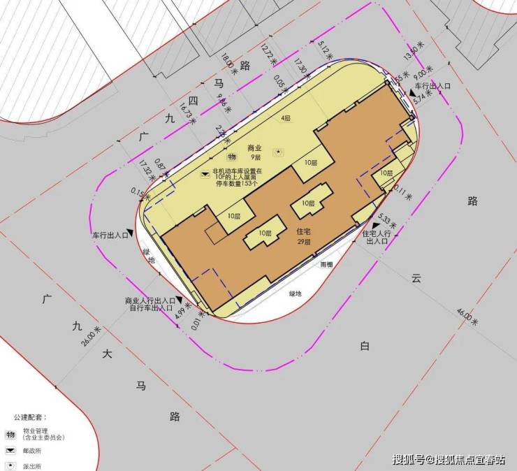 去年9月获批的设计规划显示,项目将建设1栋29层的商住综合楼(带3层地下室),其中1-3层为邮政所、派出所等公建设施,4-9层为商业,10楼架空,11-29层为住宅。