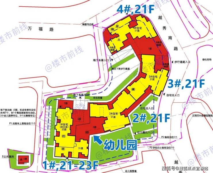 至于项目自身规划方面,占地仅8470㎡,规划4栋21-23层建筑(3栋商品房+1栋回迁房),配建1所幼儿园+约3000㎡底商以及老年服务站等设施。