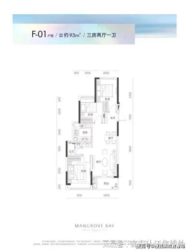 F01户型93平3房2厅1卫:户型点评客厅、餐厅连通阳台,自然采光充足宽景竖厅,空间开阔的湾际礼遇主卧独立卫生间,隐私雅奢生活动静干湿分离,生活有序互不干扰