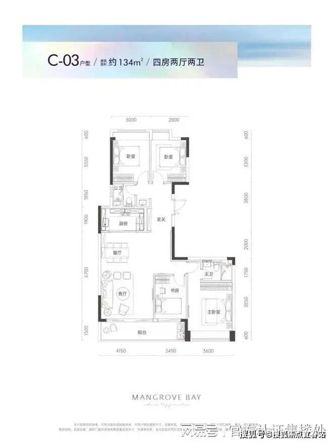 C03户型134平4房2厅2卫:户型点评方正紧凑格局,合理精研每一寸空间独立私家书房,闲暇徜徉书海诗山约6.6米宽阔景观阳台,俯瞰红树林自然生态客厅、餐厅连通阳台,自然采光充足主卧飘窗,尽享超大采光面、无遮瞰景