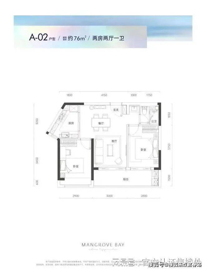 A02户型76平2房2厅1卫:户型点评房间和客厅朝南向,采光充足湾际视界约5.8米开阔观景阳台,俯瞰红树林自然生态动静干湿自然分离,生活有序互不干扰郎阔双厅设计,开启美好家庭欢乐时光