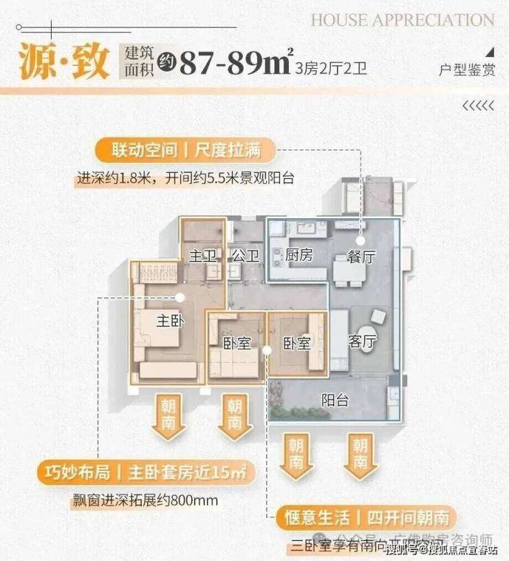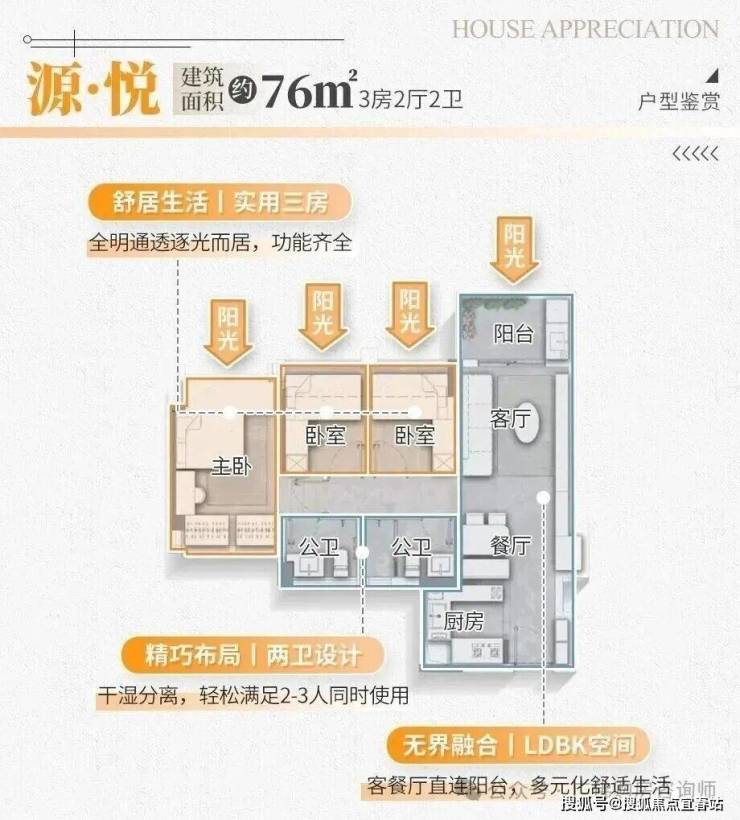 4、产品设计与品质,户型实用率约100%,得房率高,如76㎡三房两厅两卫户型空间利用高效,大横厅、大阳台设计提升居住舒适度。园林规划以“活力剧场,都市森林”为理念,打造约4.4万平方米中央园林,楼间距最大约160米,居住体验较好。
