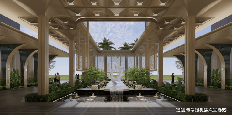 一重酒店式落客前场,超高挑空的落客区域尽显气度。二重入口前厅,约2.6 米艺术主题雕塑与水景相映成趣。