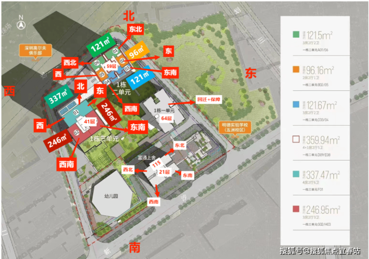 项目位于福田区沙头街道新沙路18号,项目由3栋超高层建筑及1栋多层建筑构成,包含回迁房、保障房、商品住宅、酒店及商务公寓等业态,配建一所幼儿园,旁边规划建设一所小学。1栋由回迁房与保障性住房组成,64层加地下3层,楼高196.8米。2栋为商品住宅,59层加地下5层(含两层半地下室),楼高189.15米。3栋由酒店、商务公寓、人才住房组成,40层加地下4层(含一层半地下室)楼高172.85米。本期销售住宅有260户,其中户型套内建筑面积小于90㎡为230套,占比88.46%。