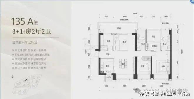 104㎡的3房2厅2卫,A1户型(2栋3单元03户型),设计的是竖厅类双龙抱珠格局,客厅3.6米开间,客餐厅一体化设计,3个卧室分别做到了主卧12.8㎡/次卧12㎡/次卧8.7㎡(包含墙体飘窗),客厅连接次卧出6.5米长的宽景大阳台,U型厨房,公卫三段式分离,得房率约90%(包含赠送),东南朝向。