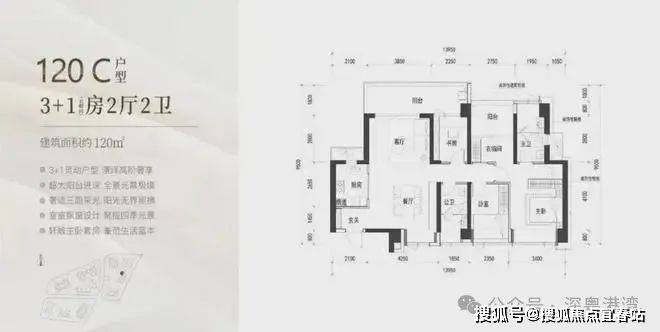 102㎡的3房2厅2卫,C户型(1栋1/2单元02户型),设计的是竖厅格局,客厅3.6米开间,LDK一体化设计,3个卧室分别做到了主卧16.93㎡/次卧9.24㎡/次卧8.96㎡(包含墙体飘窗),客厅连接次卧出6.4米长的宽景大阳台,U型厨房,卫生间干湿分离,得房率约90%(包含赠送),西南或东北朝向。